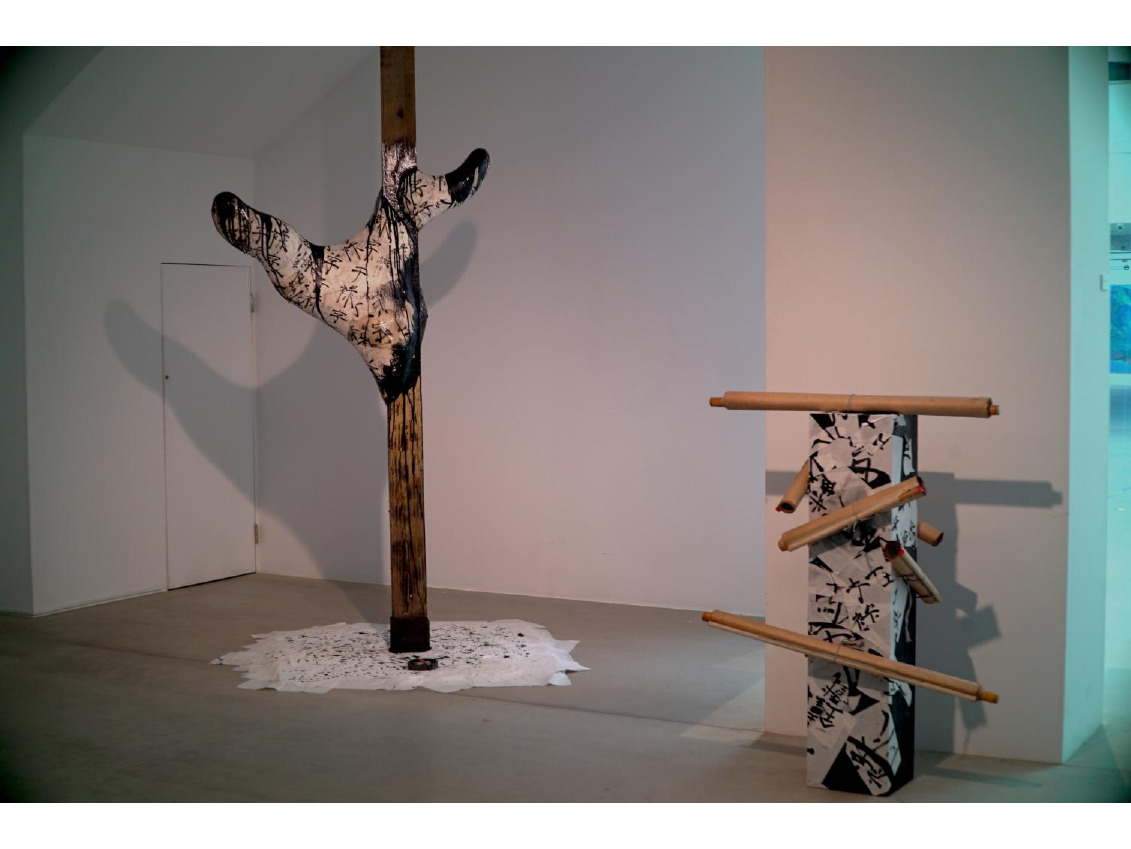作品是一項藝術研究計畫,其將會有系列(一)墨門、系列(二)墨窗、系列(三)墨頂、系列(四)墨生,作為研究路徑,2022年將參展中,系列(一)、(二),作為階段性的呈現。今年要將其系列一至三完整呈現當Temu化身為爺爺當時的狀態後,要如何在抽離自我身份的循環裡,將泰雅族與山東人那兩種不同的生活思維在重疊中,怎麼同時尋找一種可以被解釋的出口,而這出口就是爺爺所熟悉的工具,墨寶及書,因它佐證了Temu在夢境中看見爺爺與家族祖先並列同位的原因。於是Temu將藉由他的身體,讓爺爺的遺物來修補他在山上留下的破碎家屋,用以擬墨(frp)型態將家屋重新建構,而門、窗、屋頂就成為了完整家屋的要素。系列四墨生,將用影像記錄的方式,呈現過去他在部落中實踐的重要軌跡,爺爺的朋友、學生、家人、同事們,將藉由影像紀錄的方式來回應爺爺的一生。系列(一)、(二)作品材質運用大量的frp鑲嵌著爺爺留下來的遺物,是因為它本身具有的修補工法能將《爺爺山上的家屋重建計畫》系列中的「重建」概念具現化,並同時又擁有了流體物質的特型能將墨的形象重塑,除此之外,他的墨寶與書法呈現的像是他在書房中完成了他一生的作為。