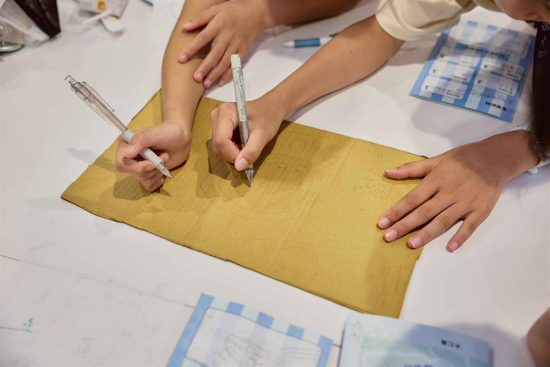 原以為是孩子沒有想法,但尤幹進去組內才發現,每個孩子的便條紙上都畫得滿滿的!「這和我在國小教學時很像,當沒有人擔任主導或意見分歧時,我才會介入。我的工作是引導他們表達,再整合意見,由繁入儉。」