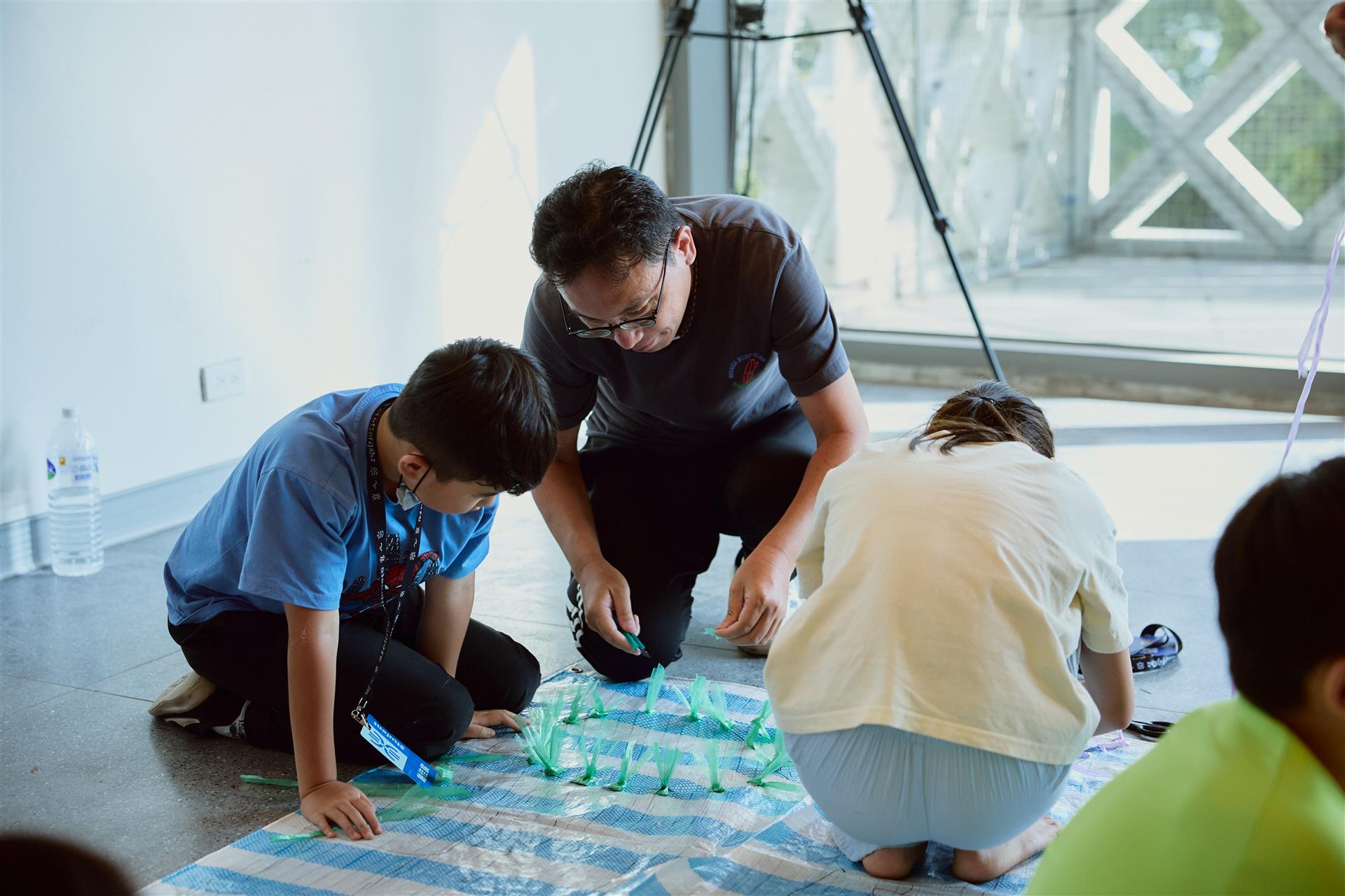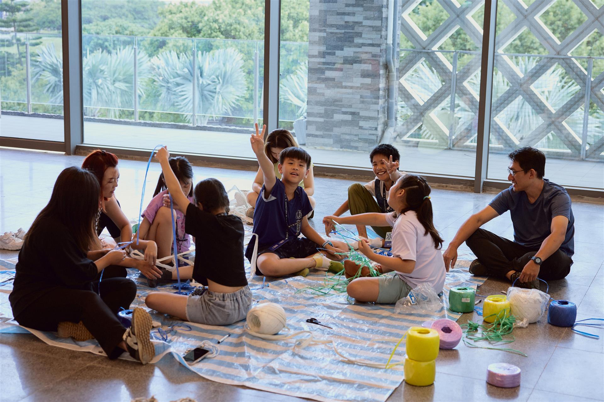 原本喧鬧的氣氛,隨著席地而坐而漸漸安靜沉澱。午後陽光斜斜灑入,四處交織的各色膠繩,如同牽繫著父母與孩子的線,但同時空氣中也有股幽微而隱形的力量,輕輕地、短暫地劃開彼此的連結。