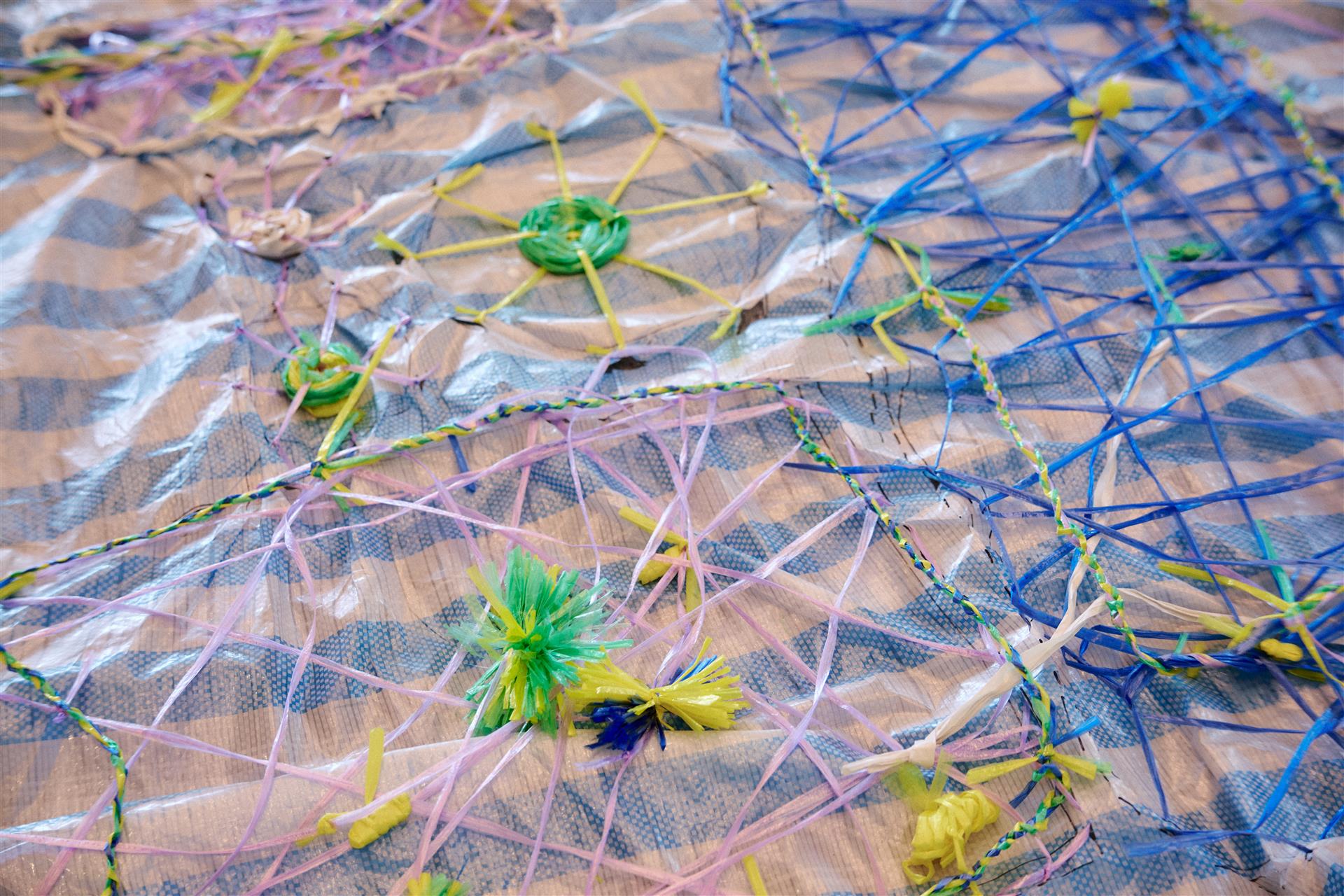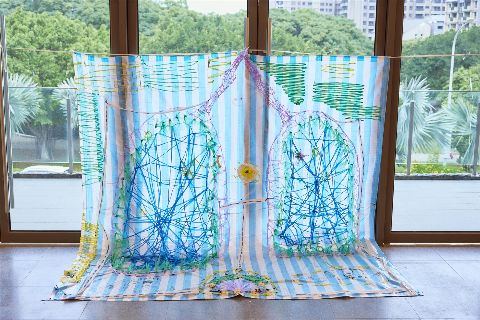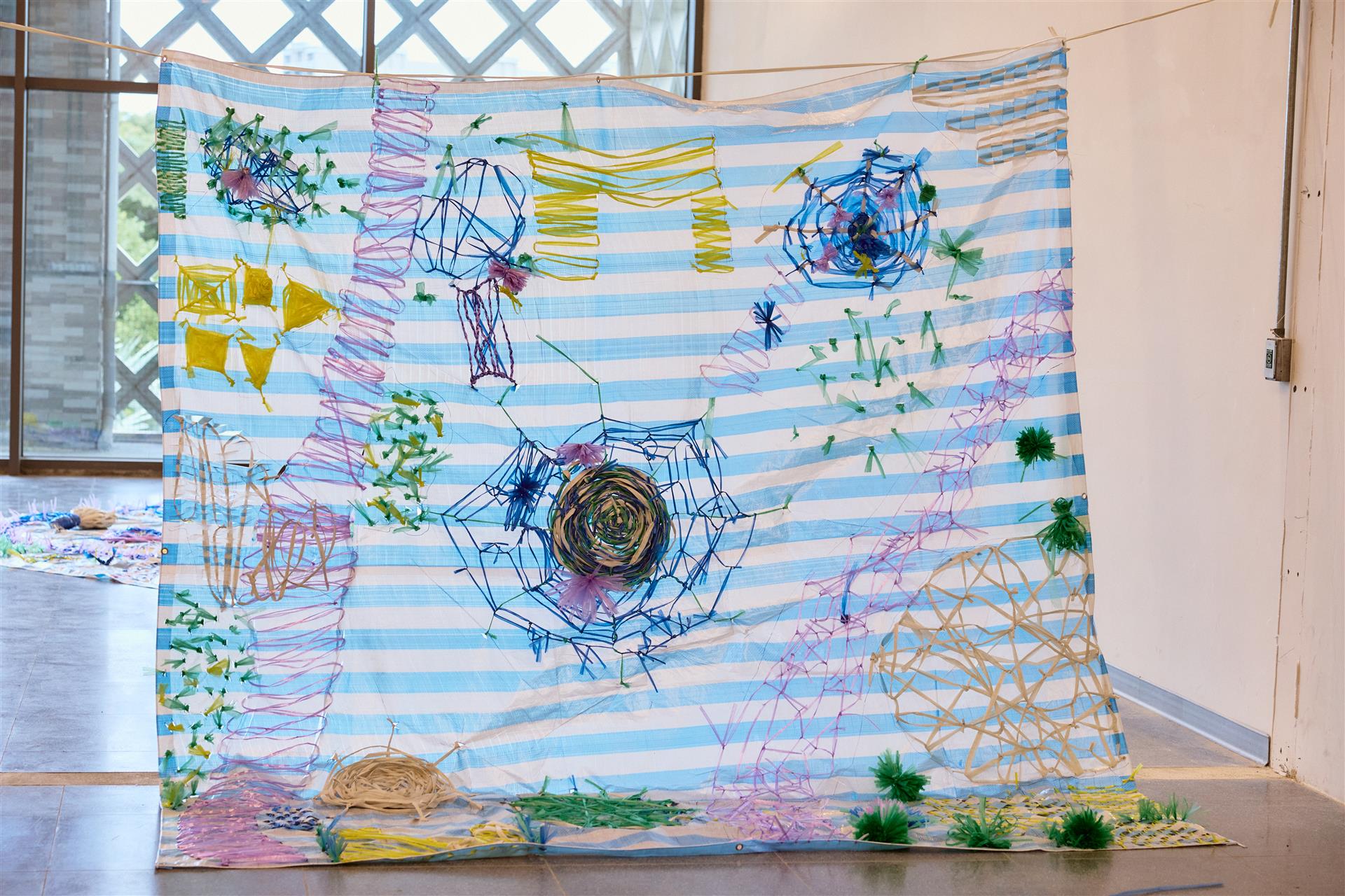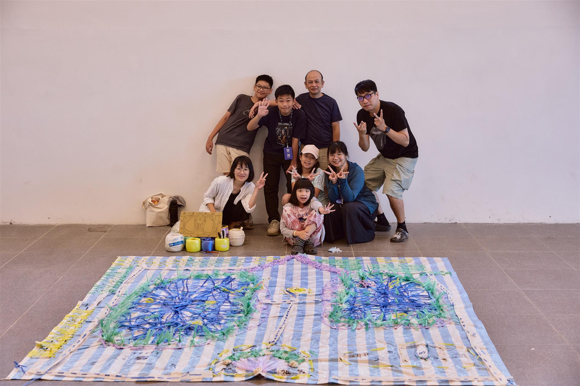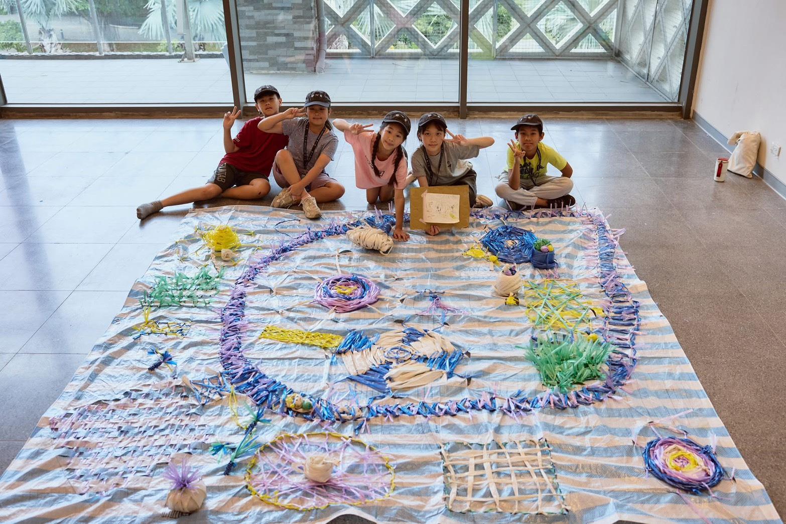 因為接下來是兩日工作坊壓軸的重頭戲——各小組的成果分享。在與之相處一天半的藍白帆布前,由各組的孩子來主述,分享他們是如何將對埤塘的感受與自己的想像結合,再轉化為繽紛的膠繩編織創作。
